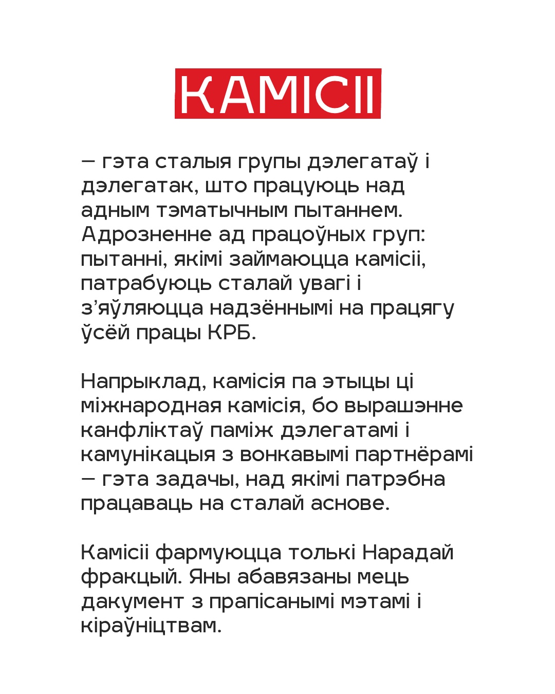 Але акрамя фракцый, унутры КРБ існуюць і іншыя формы аб’яднанняў дэлегатаў і дэлегатак: працоўныя групы і камісіі. З адной з камісій мы таксама ўжо паспелі пазнаёміцца – з Міжнароднай камісіяй, кіраўніцай якой стала Таццяна Марыніч.