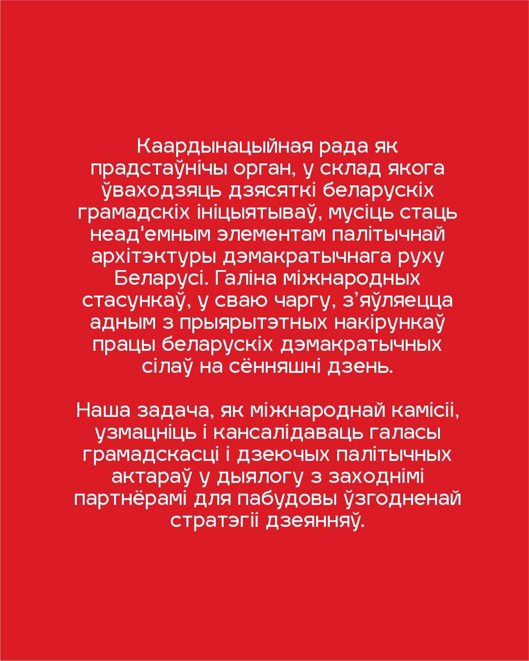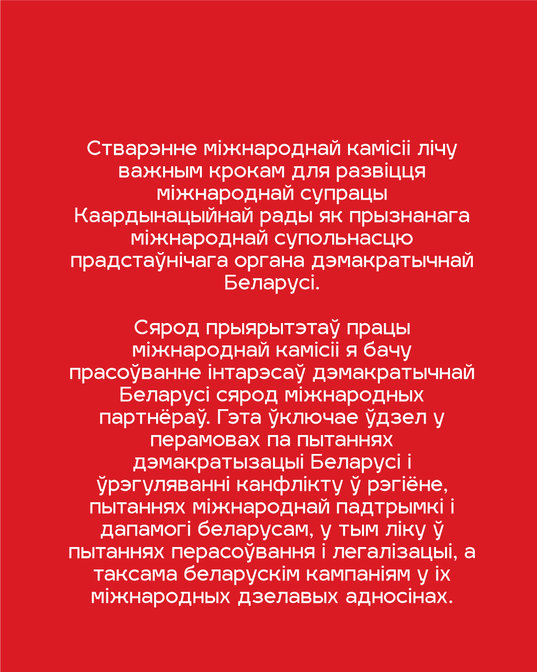 З мэтай болей эфектыўнага міжнароднага супрацоўніцтва ў Каардынацыйнай радзе была створана Міжнародная камісія. Яе кіраўніцай стала заснавальніца Imaguru Таццяна Марыніч, а намесніцай кіраўніцы — каардынатарка Free Belarus Center Паліна Бродзік.