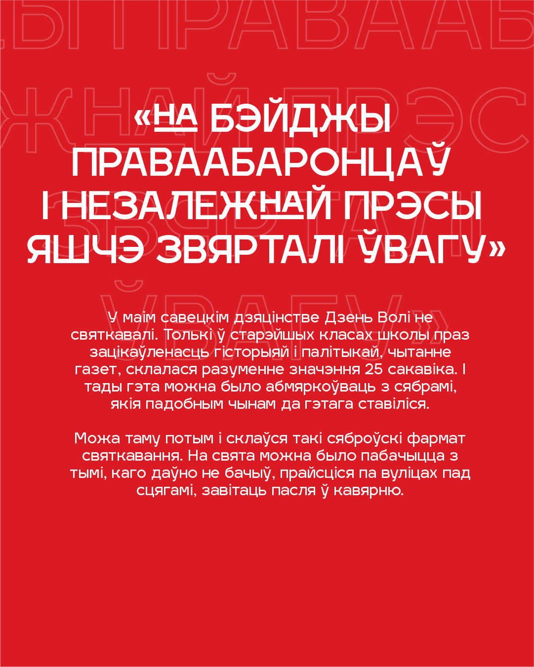 Сёння беларускія гарады не выйдуць на маршы свабоды, але святы салідарнасці з беларусамі будуць па ўсім свеце. Гэта наша свята, і забараніць яго можна толькі на паперы. Нават каляндар нам сёння зрабіў выходны дзень.